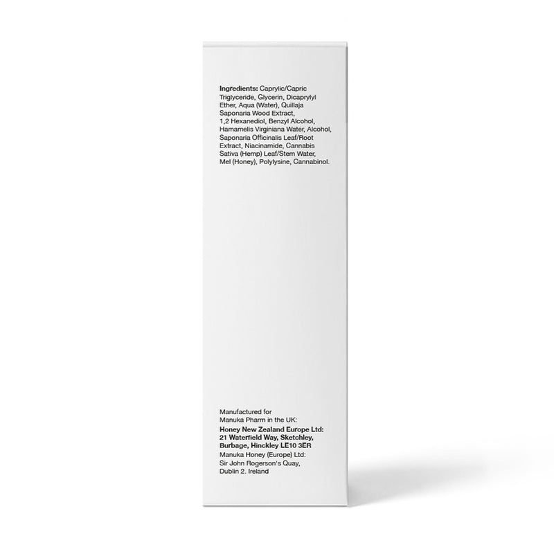 Caprylic/Capric Triglyceride, Glycerin, Dicaprylyl Ether, Aqua (Water), Quillaja Saponaria Wood Extract, 1,2 Hexanediol, Benzyl Alcohol, Hamamelis Virginiana Water, Alcohol, Saponaria Officinalis Leaf/Root Extract, Niacinamide, Cannabis Sativa (Hemp) Leaf/Stem Water, Mel (Honey), Polylysine, Cannabinol.
